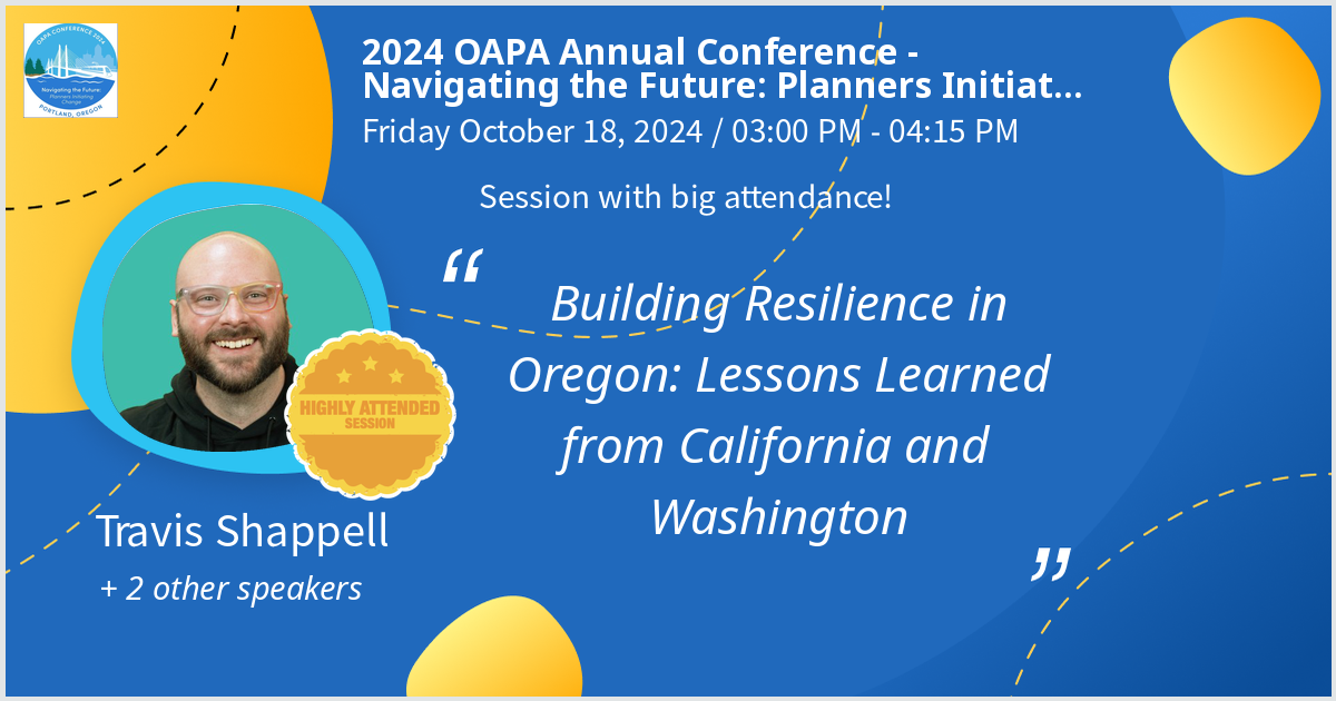 Travis Shappell had the pleasure of MCing and presenting (alongside Consuelo Crow, Meg Horst, and Tim Smith) at the 2024 OAPA on resilience and resilience hubs. Below is a brief overview of our key takeaways and link to the presentation: Building Resilience in Oregon - Lessons Learned from California and Washington.